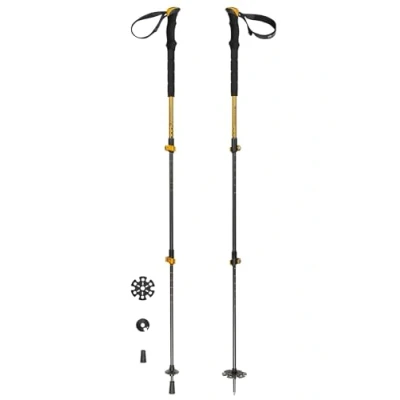 Made of high quality material Double wheels for summer or winter hikes Three section telescope with eccentric adjustment Tungsten toe cap with non-slip silencer