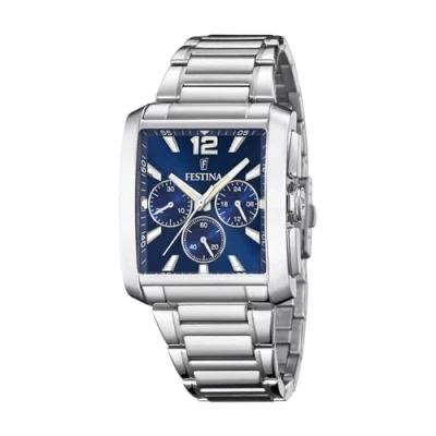 Men's analog chronograph watch. Rectangular silver 316l stainless steel case. Silver coloured 316l stainless steel strap with double push-button closure. Rectangular silver coloured dial with mineral glass. Water resistance: 5 ATM.