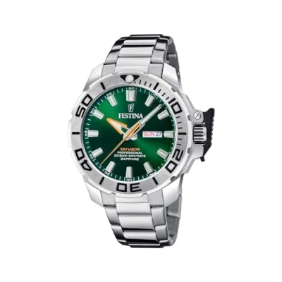 Men's quartz hour and minute watch. Round 316L stainless steel case in silver colour. Silver-coloured 316l stainless steel band with deployant clasp. Round green dial. Water resistance: 20 ATM.