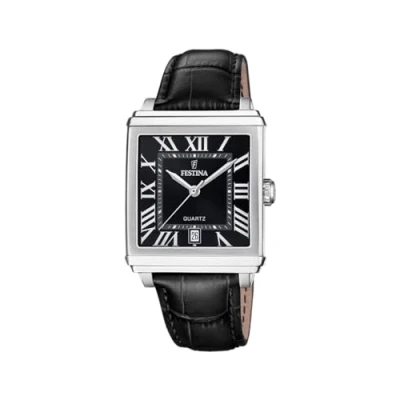 Men's quartz hour and minute watch. Rectangular stainless steel case, grey colour. Black leather strap with buckle closure. Rectangular black dial made of mineral glass. Water resistance: 5 atm.