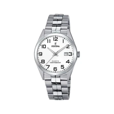 stylish wristwatch for men, silver case made of stainless steel with about 40mm diameter silver stainless steel strap with folding clasp and an adjustable length of about 14cm to 22cm white dial with silver-colored hands, Arabic numerals, Festina logo Case diameter: 40mm, case height: 8mm up to 10 bar waterproof