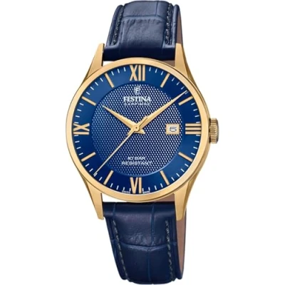 Festina Watch for Men F20010/3 Swiss Made Gold Stainless Steel case Blue Leather Strap, and Gold, groß, Bracelet