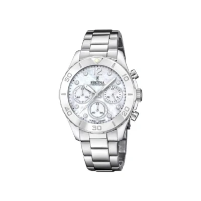 Women's watch made of stainless steel from Festina in the colour silver-cream The watch has a silver stainless steel case with a diameter of 39 mm Cream dial, silver hands, mineral glass, folding clasp, sparkling zirconia, Festina logo The watch has a water resistance of 10 bar (suitable for swimming and snorkelling) The watch is equipped with a quartz movement