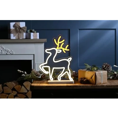 AmazonMAGICAL REINDEER DESIGN – 36cm reindeer neon flex light sign with warm white and yellow LEDs, mounted on a sturdy base for a modern festive look BRIGHT LED LIGHTING – Features 215 multicolour LEDs that create a glowing outline, perfect for indoor seasonal decoration EASY TO DISPLAY – Compact size ideal for placing on mantels, windowsills, sideboards, or as part of a festive display SAFE & RELIABLE – Transparent 3m lead cable with IP20 transformer for indoor mains-powered use FESTIVE PRODUCTIONS QUALITY – A durable and reusable Christmas light decoration designed for magical seasonal displays year after year