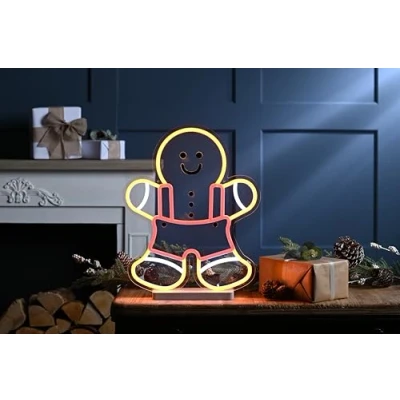 AmazonFUN GINGERBREAD MAN DESIGN – Charming LED light sign shaped like a gingerbread man with colourful detailing, perfect for festive displays LARGE 42CM SIZE – Stands out as a centrepiece for your Christmas decorations, ideal for windows, shelves, or tabletops BRIGHT MULTICOLOUR LEDS – Features 287 neon-style LEDs that produce a vibrant, eye-catching glow SAFE & EASY TO USE – Includes 3m transparent lead cable and low-voltage mains transformer for safe indoor use FESTIVE HOME DECOR – Adds a playful and cheerful touch to your seasonal setup, enjoyed by both children and adults
