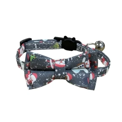 Festive Christmas Cat Collar with Bow Tie, Quick Release Safety Buckle & Bell (Grey)