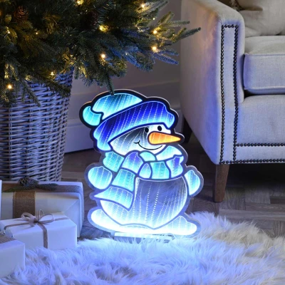 Bring the magic of winter into your home with the 40cm Infinity Snowman, a delightful decoration thats sure to enchant both children and adults alike. This charming snowman, glowing in a cool blend of white, blue, and green, features the mesmerizing infinity light effect, creating an illusion of endless twinkling lights that adds depth and wonder to any festive display.Standing on a sturdy wooden base, this snowman is perfect for lighting up any corner of your home, whether hes placed by the tree, welcoming guests in the hallway, or spreading holiday cheer in your living room. His frosty colours and captivating glow make him a standout feature in your seasonal décor. The 3-metre lead length offers flexibility in placement, allowing you to position him wherever hell shine brightest.Designed for safe and energy-efficient indoor use, this snowman comes with a transformer rating of IP20/12V/6W, ensuring he will spread joy year after year. Let the Infinity Snowman with his cool, shimmering colours bring the spirit of winter to life, filling your home with warmth, wonder, and a touch of festive magic.
