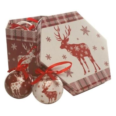 General description Complete your Christmas tree with our 14 piece Christmas tree bauble set featuring assorted shapes and designs with charming reindeer motifs. This vintage-inspired set includes shiny, matte, and glitter finishes, all beautifully decoupaged in red with snowflake and reindeer patterns. The baubles come in a lovely gift box for easy storage after the holiday season, allowing you to enjoy them year after year. Technical specifications Number of pieces: 14 Diameter of each bauble: 7.5 cm (3 inches) Other information Also available in gold