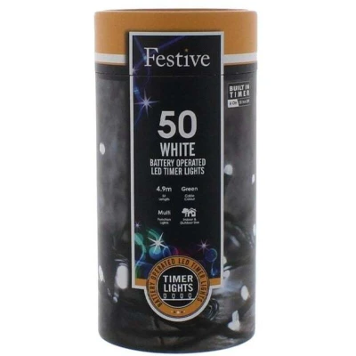 General description Light up your home with these battery-powered Christmas lights, featuring 50 white LED lights that create a warm festive atmosphere. With multi-function settings for various lighting patterns and a built-in timer for 6 hours on and 18 hours off, you can enjoy the holiday spirit whenever you want. Ideal for decorating your Christmas tree, windows, walls, and outdoor areas like patios, these lights are suitable for both indoor and outdoor use. Technical specifications Length: 1990 cm Number of lights: 50 white LED lights Lead length: 0.3 m Lit length: 4.9 m Bulb spacing: 10 cm Power source: Battery-operated Compatibility and accessories Available in multiple colours Available in sizes: 50 LED Lights, 100 LED Lights, 200 LED Lights, 400 LED Lights
