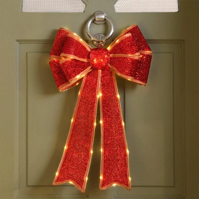 Festive Red Battery Operated Christmas Door Bow with 84 Warm White LEDs