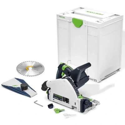 General description The Festool 36v Cordless Plunge Saw TSC 55 KEB is engineered for professionals seeking precision, safety, and power in their cutting tasks. With its innovative KickbackStop technology, this saw minimizes the risk of injury from kickback, allowing for fast and accurate cuts across various materials, including wood and metal. The saw is designed for high efficiency, featuring a brushless motor paired with lithium-ion batteries for enhanced cutting power and reduced maintenance. Technical specifications Battery Voltage: 2 x 18 V Idle Engine Speed: 2,650 - 3,800/5,200 min⁻¹ Saw Blade Diameter: 160 mm Angular Range: -1° to 47° Cutting Depth: 0 - 55 mm Cutting Depth at 45°: 43 mm Dust Extraction Connection Diameter: 27/36 mm Product Weight (without accessories): 3.6 kg Transport Weight (incl. accessories): 7.7 kg A-weighted Sound Pressure Level (LpA): 95 dB(A) A-weighted Sound Power Level (LWA): 106 dB(A) Total Vibration Average (Ah) for Wood: 2.5 m/s² Total Vibration