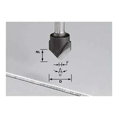 Special cutter for processing aluminium composites De gran durabilidad gracias a sus filos recubiertos de carburo Box contents: Festool V-groove cutter HW S8 D18-90°/aluminium With this cutter a groove of 90° is milled Technical features: S 8 mm; D 18.00 mm; NL 8.00 mm; GL 59.00 mm; alpha 90.00 °; contents: 1 piece, Weight: 2.20462262E-5 pounds, Manufacturer: Festool