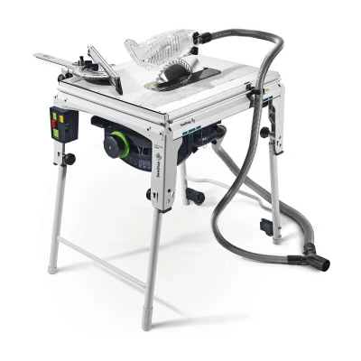 General description With the new Festool TKS 80 table saw, the risk of serious cutting injuries is significantly reduced, allowing you to focus on your work while ensuring the safety of your fingers. This saw features advanced SawStop technology, which can be deactivated if necessary, providing enhanced safety when cutting non-conductive materials. The saw is designed for flexibility, accommodating large workpieces with an 80mm cutting height and an extendable work surface. Additionally, it minimizes splintering during mitre rip cuts by allowing the saw blade to swivel to the left. The integrated dust extraction system ensures a clean workspace, while the attached tool garage offers convenient storage for essential accessories. Technical specifications Power consumption: 2200 W Idle engine speed: 1700 - 3500 min Blade diameter: 254 mm Cutting height: 90° / 45° - 80 / 56 mm Inclination: -2° / 47° Table dimensions: 720 x 850 mm Table height (legs folded away): 385 mm Table height (legs