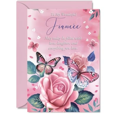 Fiancée Birthday Card Pink Rose Butterfly Beautiful Happy for from Partner Fiancé, A5 Female Floral Bday Greeting Cards