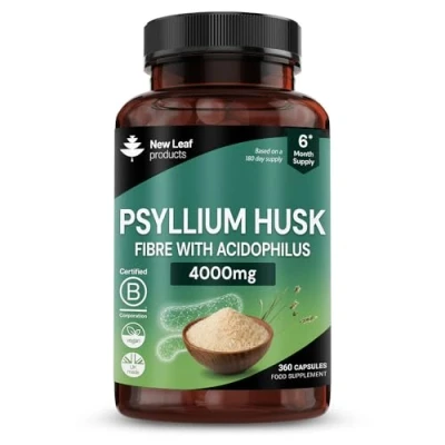 Fibre Supplement 4000mg Psyllium Husk With Probiotic Acidophilus High Strength Natural Soluble Fiber From Plantago Ovata Seeds, 360 Husks capsules Vegan, Made in UK by New Leaf