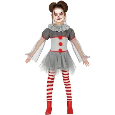 BECOME A FUN CLOWN! - Includes collar, tights and dress in grey and red. Makeup, shoes and wig are not included. Perfect for a night full of laughter and spooky on Halloween! Sizes: children's size 7-9 years. Designed for a perfect fit so little ones can move freely and have fun at any celebration. Ideal for carnival, Halloween and costume parties. Evil clown costume for girls – made of flame retardant polyester, this costume in grey and red is perfect for shining on Halloween and creepy parties. Ideal for children aged 7-9 years. Turn every party into a scary adventure! - This evil clown children's costume for girls (7-9 years) provides unforgettable moments full of laughter and scary surprises. Costumes and accessories for any occasion – at Fiestas Guirca you will find costumes, accessories and decorations for Halloween, carnival, bachelor parties and more. Visit our Amazon store for more choices., Manufacturer: FIESTAS GUIRCA