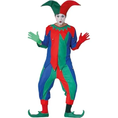 BECOME THE JESTER OF THE PARTY! - Includes the jacket, bells, hat, and trousers. Does not include makeup or shoes. Get ready to make everyone laugh with your medieval style! DIMENSIONS - Size 44-46 (XL). Ideal for adults, with a comfortable and roomy fit. IDEAL FOR MEDIEVAL AND CLOWN THEMED PARTIES - This fun fancy dress in blue and multicoloured will ensure everyone has a fantastic time. BECOME THE FUNNIEST JESTER AT THE PARTY! - Adult jester fancy dress with tunic, trousers, and hat. Perfect for medieval and clown parties, guaranteed fun! COSTUMES AND ACCESSORIES FOR ALL OCCASIONS - At Fiestas Guirca, we have costumes, accessories, and decorations for Halloween, Carnival, Hen/Stag Parties, and more. Visit our Amazon store to see more., Manufacturer: FIESTAS GUIRCA