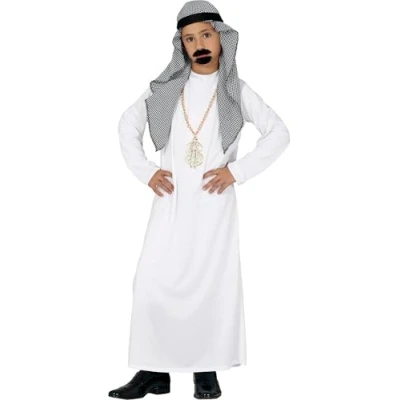 BECOME A DESERT PRINCE! - Includes headdress and tunic. Does not include necklace, moustache or shoes. Perfect for themed parties and unforgettable celebrations! DIMENSIONS - Children's size 5-6 years. CHILDREN'S SHEIKH COSTUME - Made from fire-retardant polyester. Perfect for themed parties and role play. Colours: white and grey. TURN YOUR LITTLE ONE INTO A DESERT PRINCE! - Children's Sheikh fancy dress with headdress and tunic, perfect for themed parties and endless fun. COSTUMES AND ACCESSORIES FOR ALL OCCASIONS - At Fiestas Guirca, we have costumes, accessories, and decorations for Halloween, Carnival, Hen/Stag Parties, and more. Visit our Amazon store to see more., Manufacturer: Fiestas Guirca