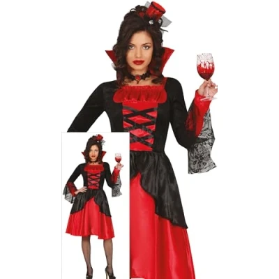 CONTENTS of this bloodthirsty vampire women fancy dress costume: dress. NOT_INCLUDED: top hat, necklace, bloody glass, cobweb tights COSTUME SIZE GUIDE: Women 8-10 (S) APPROXIMATE DIMENSIONS OF THIS FANCY DRESS: Bust 31.5-35.5 inches, Waist 26-27.5 inches, Hips 37-38 inches MATERIALS: These Halloween fancy dress costumes are made of 100% polyester and meet all safety standards so that you can have a great time at your next costume party. FIESTAS GUIRCA fancy dress costumes for men and women: a great choice for your theme party or Halloween party, Manufacturer: FIESTAS GUIRCA