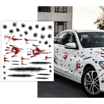 TRANSFORM YOUR CAR INTO A HORROR MASTERPIECE! - Includes stickers to create a chilling effect. Car and other decorative items not included. Perfect for surprising at Halloween! DIMENSIONS - Adhesive sheet for car measuring 30x40 cm, perfect for decorating your vehicle for any occasion. MATERIALS - Made with high-quality adhesive. Perfect for personalising your car. Available colours: white and red. DECORATE YOUR CAR FOR HALLOWEEN AND WOW EVERYONE! - Spooky stickers for an unforgettable party. Having fun has never been easier! COSTUMES AND ACCESSORIES FOR ALL OCCASIONS - At Fiestas Guirca, we have costumes, accessories, and decorations for Halloween, Carnival, Hen/Stag Parties, and more. Visit our Amazon store to see more., Manufacturer: GUIRCA