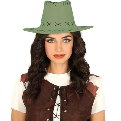 BECOME A STYLISH COWBOY! - Includes the green faux leather cowboy hat. Other accessories and clothing not included. Perfect for your themed parties and to showcase your western spirit! DIMENSIONS - One size fits all. Suitable for all users. FAUX LEATHER COWBOY HAT - Ideal for adding an authentic touch to your themed parties. Perfect for fancy dress and events. Colour: green. RIDE TO THE RANCH IN STYLE! - Green faux leather cowboy hat, perfect for themed parties and celebrations. Having fun has never been so enjoyable! COSTUMES AND ACCESSORIES FOR ALL OCCASIONS - At Fiestas Guirca, we have costumes, accessories, and decorations for Halloween, Carnival, Hen/Stag Parties, and more. Visit our Amazon store to explore further., Manufacturer: GUIRCA