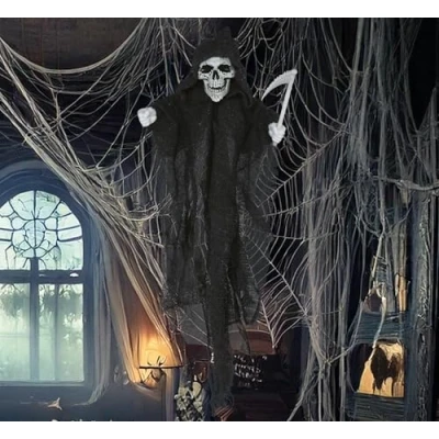 FIESTAS GUIRCA Hanging Skeleton with Scythe (19.7 in) Halloween Decoration for Horror Parties and Celebrations Ideal Spooky Environments Scary Scenes Grey