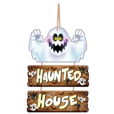 FIESTAS GUIRCA Haunted House Wooden Sign (32x21 cm) Wall, Door and Window Decoration for Halloween Ghost Parties Ideal Spooky Celebrations Brown White