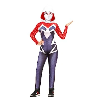 FIESTAS GUIRCA Hooded Heroine Fancy Dress Costume Red & Black Spider Pattern Superhero Jumpsuit with Hood Kids Costumes Girls 7 9 years