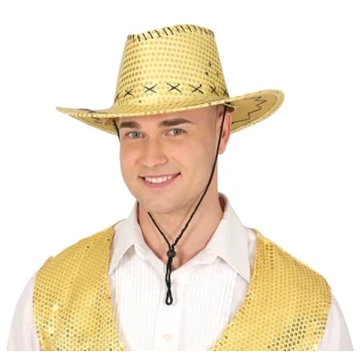 CONQUER THE WEST IN STYLE! - Includes the gold sequined cowboy hat. Shirt and other accessories not included. Perfect for your stag do or any cowboy-themed celebration! DIMENSIONS - One size fits all. Suitable for all users. SHINE AT THE PARTY WITH THIS SEQUINED COWBOY HAT! Made from polyester, it’s perfect for adding a fun touch to your fancy dress outfits. Colour: gold. ADD A SPARKLING TOUCH TO YOUR PARTY! - Gold sequined cowboy hat for adults, perfect for hen dos and themed parties. Having fun has never been so glamorous! COSTUMES AND ACCESSORIES FOR ALL OCCASIONS - At Fiestas Guirca, we have costumes, accessories, and decorations for Halloween, Carnival, Hen/Stag Parties, and more. Visit our Amazon store to explore further., Manufacturer: GUIRCA