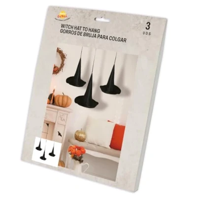 DECORATE WITH MAGIC! - Includes 3 hanging witch hats, each 18 cm. Does not include the pumpkin, candles, or other decorative items. Create a charming atmosphere for your Halloween party! DIMENSIONS - Set of 3 hanging witch hats, each measuring 18 cm. MATERIALS - Set of 3 hanging witch hats, made from polyester. Perfect for decorating your Halloween parties. Product colour: black. DECORATE YOUR HALLOWEEN PARTY WITH THESE WITCH HATS! - Set of 3 hanging hats, perfect for creating a spooky and fun atmosphere. COSTUMES AND ACCESSORIES FOR ALL OCCASIONS - At Fiestas Guirca, we have costumes, accessories, and decorations for Halloween, Carnival, Hen/Stag Parties, and more. Visit our Amazon store for more., Manufacturer: GUIRCA