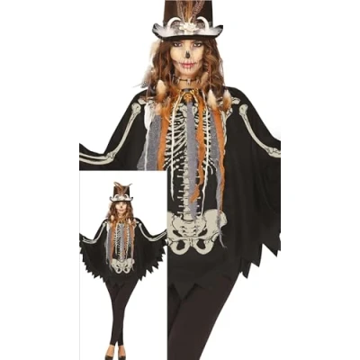 CONTENTS of this skeleton poncho women fancy dress costume: black poncho with skeleton print and strips of fabric. NOT_INCLUDED: top hat with feathers, teeth necklace, bones necklace, leggings COSTUME SIZE GUIDE: Women 14-16 (L) APPROXIMATE DIMENSIONS OF THIS FANCY DRESS: Bust 39-40.5 inches, Waist 31-33 inches, Hips 41.5-43 inches MATERIALS: These Halloween fancy dress costumes are made of 100% polyester and meet all safety standards so that you can have a great time at your next costume party. FIESTAS GUIRCA fancy dress costumes for men and women: a great choice for your theme party or Halloween party, Manufacturer: FIESTAS GUIRCA