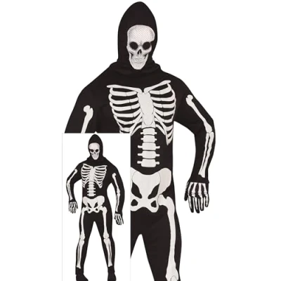 CONTENTS of this spooky skeleton men fancy dress costume: hood with skull print, jumpsuit. NOT_INCLUDED: skeleton gloves COSTUME SIZE GUIDE: Men 38-40 (M) APPROXIMATE DIMENSIONS OF THIS FANCY DRESS: Chest 37-39 inches, Waist 33-35 inches, Hips 38-39 inches MATERIALS: These Halloween fancy dress costumes are made of 100% polyester and meet all safety standards so that you can have a great time at your next costume party. FIESTAS GUIRCA fancy dress costumes for men and women: a great choice for your theme party or Halloween party, Manufacturer: FIESTAS GUIRCA