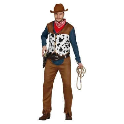 CONTENTS of Western Cowboy Costume: T-shirt with vest, trousers with belt. NOT INCLUDED: cowboy hat, any further accessories. COSTUME SIZE GUIDE: Men L 42-44 APPROXIMATE COSTUME DIMENSIONS: Chest 40"- 42" Waist 36"-37" Hips 42"- 44" MATERIALS: This fancy dress is made of polyester and conforms to all safety standards FIESTAS GUIRCA: a great choice for your fancy dress or theme party, Manufacturer: FIESTAS GUIRCA