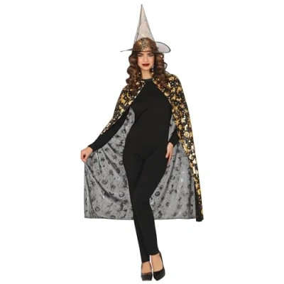 BECOME THE MOST ENCHANTING WITCH! - Includes the cape and hat. Dress and other accessories not included. Perfect for dazzling at Halloween and other parties! DIMENSIONS - Adult hat and cape set, with a total length of 110 cm. MATERIALS - Witch hat and cape set made from polyester. Perfect for adding a mysterious touch to your fancy dress. Product colour: black. TRANSFORM INTO A MYSTERIOUS WITCH! - 110 cm hat and cape set, perfect for Halloween and themed parties. Having fun has never been easier! COSTUMES AND ACCESSORIES FOR ALL OCCASIONS - At Fiestas Guirca, we have costumes, accessories, and decorations for Halloween, Carnival, Hen/Stag Parties, and more. Visit our Amazon store for more., Manufacturer: FIESTAS GUIRCA