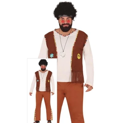 CONTENTS of this woodstock hippie mens fancy dress costume: Headband, Shirt, Trousers, Waistcoat. NOT_INCLUDED: Further Hippie Accessories COSTUME SIZE GUIDE: Men XL 44-46 APPROXIMATE DIMENSIONS OF THIS FANCY DRESS: Chest 44"- 45.5" Waist 39"-41" Hips 45.5"- 47" MATERIALS: These fancy dress costumes for men are made of 100% polyester and meet all safety standards so that you can have a great time at your next costume party. FIESTAS GUIRCA adult fancy dress costumes men: a great choice for your fancy dress or theme party, Manufacturer: FIESTAS GUIRCA