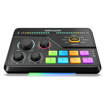 Game/Chat Balance Dial & 7.1 Immersion for Squad Domination:Rotate the dedicated Game/Chat knob to prioritize enemy footsteps or teammate communications. Combined with virtual 7.1 surround sound and three EQ presets (Game/Music/Movie), hear Valorant spikes fade from any direction while Discord chats remain crystal clear. XLR Power Unlock for Studio-Quality Voice Capture:Upgrade your microphone clarity with 48V phantom power and XLR port support, enabling high-sensitivity microphones up to -50dB gain. The dynamic/capacitive switching adapts to any microphone type. With less than 0.2% distortion and a 75dB SNR, your communications cut through explosive action clearly. Adjust microphone monitoring via the output knob on the game mixer for real-time volume awareness—perfect for intense FPS callouts. Seamless Multi-Platform Audio Control:Command all your devices effortlessly: optical AUX connects to PS4/TV, 3.5mm AUX-In mixes commentary audio, and USB-C Plug-and-Play works instantly on PC/PS5/Switch/mobile devices. Three smart knobs feature push-to-mute volume control, allowing adjustments to microphone, game, or background audio without switching screens. RGB-Infused, Stream-Ready Hub with Broadcast Flair:Synchronized RGB lighting reacts to audio peaks for visual impact. Drive 32Ω headphones with 93dB SNR fidelity, while the AUX chain lets you overlay music into your stream. Everything stays cool during 8-hour Fortnite marathons. 8-Voice Modulator & Custom Sound Profiles for Tactical Trolling:Add fun to lobby chats with one-touch voice morphing (Demon/Robot/Megaphone, etc.). Four customizable buttons save audio clips—use EQ adjustments or chat stream presets to store your Warzone gunshots for instant replies. Important Notes:The mixer is not compatible with USB microphones—only XLR or 6.35mm mics are supported. An XLR cable is not included. Audio quality may be affected by XLR cable specifications such as length, shielding, or connector condition. A shielded type is recommended.