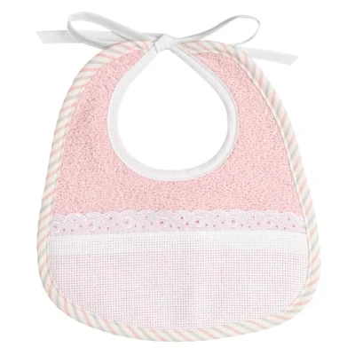 Soft terry cotton towelling bib, pink (385 g/m²) with Aida canvas pocket for embroidery, separated from the back of the bib by an elegant lace, cotton bias binding, multicoloured stripes, closure with white cotton ribbons. The white cotton terry bib measures 21 x 22 cm. The 55 hole Aida fabric bag measures 19.5cm x 7cm. To preserve the quality of the bib and the embroidery, we recommend hand washing or machine washing at max. 30°C. Suitable for all dresses and formal occasions. Aida canvas offers an already drawn path to the needle thanks to the braiding of texture and chain, which form a very precise check, which makes embroidery work much easier. The ready-made fillets are ideal for amateurs, cross stitch fans as well as for advanced users. Made in Italy - For over 20 years we have been producing baby accessories and laundry textiles. We use high-quality raw materials, non-toxic and certified for direct contact, even for babies and toddlers. The design and production are entirely made in Italy. Fillet badges are the embroidery aida canvas inserts, the use of pique and quilted fabrics with a wide range of colours and patterns, always on step with the new trends. Agofil was founded in 1995 and is the Filet brand company, known for its high quality products. Fillet products are ready to embroidery. You can personalise them to make them a unique and special gift that is handmade and with heart.