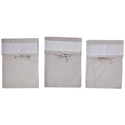 Pack of three neutral coloured cotton linen bags with different patterns (plain, polka dots, clover) Flap and bow closure; with aida cloth insert for embroidery Essential for neat and hygienic storage of the first changes to be taken to the hospital Established in 1995, agofil is the manufacturer of the brand filet, a leader in its industry, known for its high quality products. The company is distinguished by the use of high-quality raw materials; all made in Italy with 100% natural cotton.