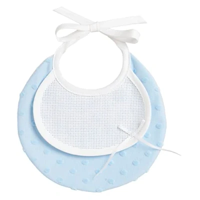 FILET Small Round Bib in Soft Fabric with Polka Dots 3D Effect Aida Canvas Insert to Embroider, Closure Laces, Ideal for Babies, Made Italy, Light Blue