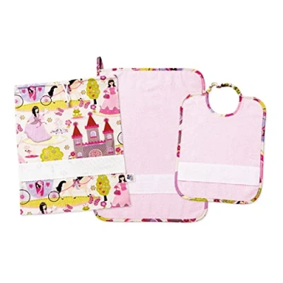 FILET Three Piece Nursery Set with Aida Needlework, consisting of a Bag, Towel and Bib in Coloured Terry Cloth, 100% Cotton, Made Italy, Princesses Pattern, Pink Patten