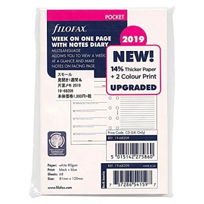 Filofax Pocket size diary Week per page diary with facing notes January to December 2019 White paper Paper size 81mm x 120mm