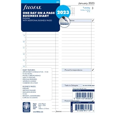 Filofax A5 diary Day per page format January to December 2023 White paper Paper size 148mm x 210mm