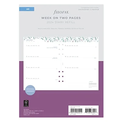 Filofax A5 2024 diary Week on two pages format Floral design at the top of each page Dotted and ruled pages at the end of each month Paper size 148mm x 210mm