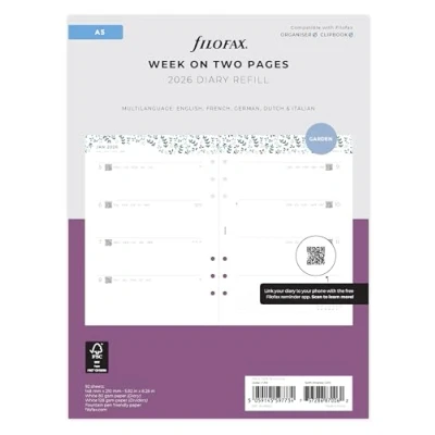 AmazonFilofax A5 2026 diary refill Week on two pages format 5 languages - English, French, German, Dutch and Italian Download the free Filofax Reminder App to use the QR codes to review your diary on your phone Paper size 148mm x 210mm