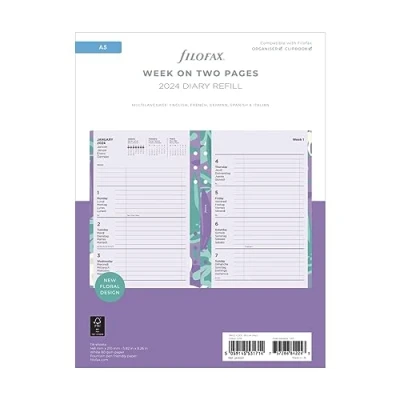 Filofax A5 2024 diary Week to view diary with floral border Plus month planners and calendars Tabbed month dividers; To Do pages and ruled notepaper Page size 148mm x 210mm