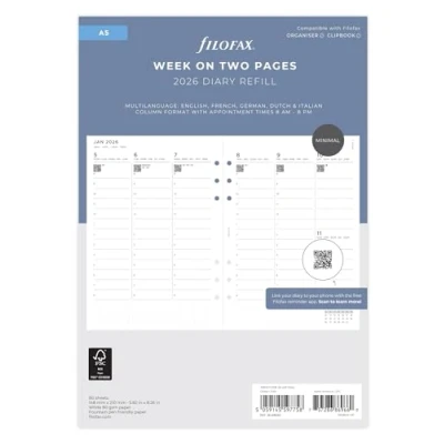 Amazon Filofax A5 2026 diary refill Week on two pages with appointments format 5 languages - English, French, German, Dutch and Italian Download the free Filofax Reminder App to use the QR codes to review your diary on your phone Paper size 148mm x 210mm