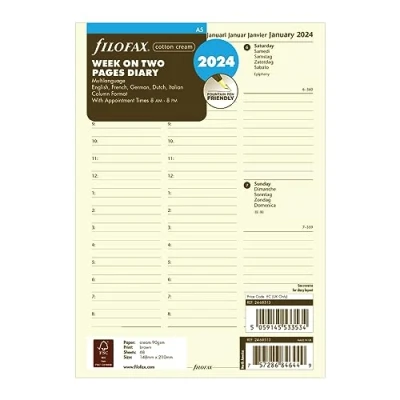 AmazonFilofax A5 2024 diary Week on two pages with appointments column format English, French, German, Dutch and Italian Cotton cream paper Paper size 148mm x 210mm