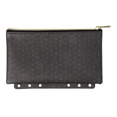 Zipped, carry-all pouch designed for pens, pencils and planning accessories Patterned in black, white, and gold tones Gold tone zip closure Filofax Accessory Size: 6.7" x 4.02" Filofax Accessory compatible with A5 and Personal size Filofax Organizers and Filofax Clipbooks