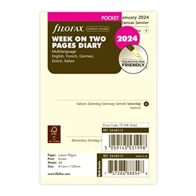 Filofax Pocket 2024 diary Week on two pages format January to December 2024 Cotton cream paper Paper size 81mm x 120mm