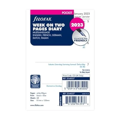 Filofax Pocket 2023 diary Week on two pages format January to December 2023 Paper size 81mm x 120mm Made in the UK